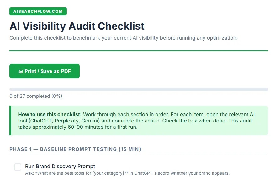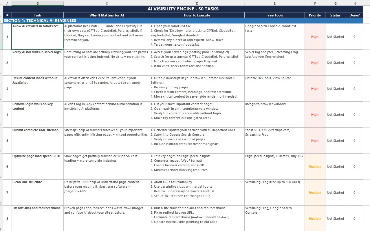 A comprehensive checklist covering every optimization signal that matters — from structured data and schema markup to citation consistency, topical authority, and content depth. Paired with a 30-day implementation roadmap that breaks the work into daily tasks of under 30 minutes, so you always know exactly what to do next.